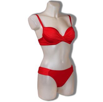 Модель Чашка формованная на кости, объём на застёжке, плавки средней высоты по бокам вставки из ткани в горошек, на груди перекрут из ткани в горошек.